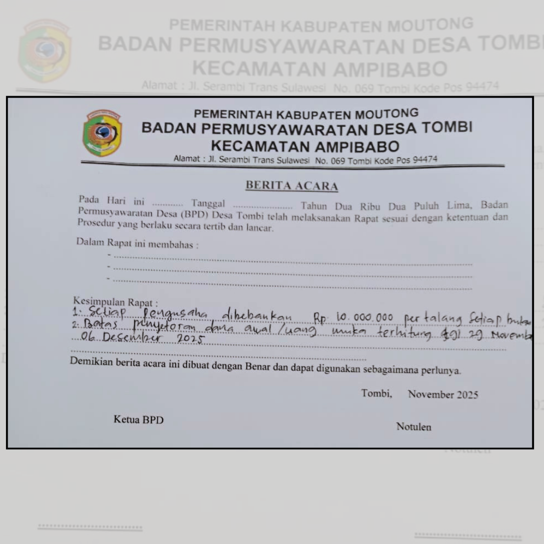 Belum diketahui secara pasti apakah dana tersebut merupakan inisiatif desa, pungutan oknum, atau mekanisme lain yang tidak memiliki landasan hukum yang jelas.
