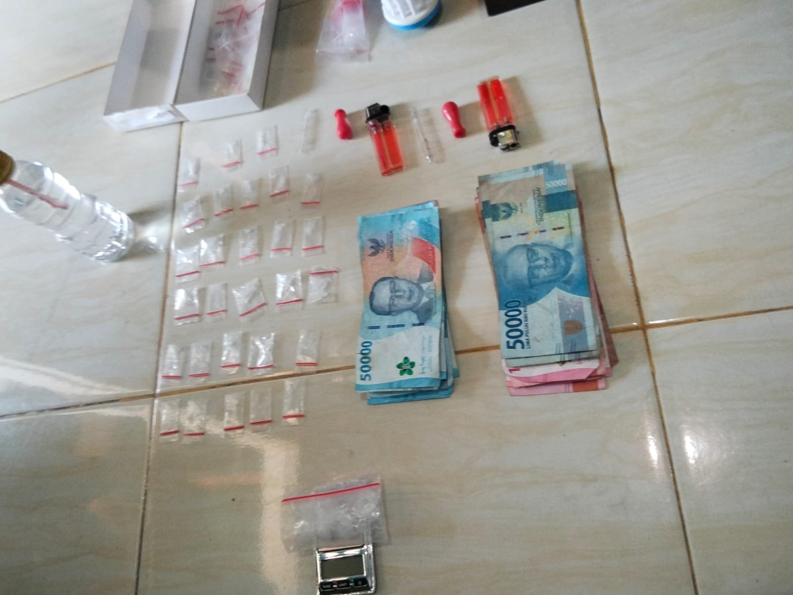 ‎”Untuk sementara barang bukti yang kami amankan terdiri dari, alat hisap atau bong, timbangan digital, 8 paket sabu seharga Rp 300 ribu, 17 paket seharga 100 ribu, 3 paket kecil seharga Rp 50 ribu, 1 paket sabu yang belum dibongkar seberat sekitar 7 gram, kemudian uang tunai sekitar Rp 1,5 juta, dengan pecahan 100 ribu delapan lembar dan pecahan 50 ribu 14 lembar,” bebernya.